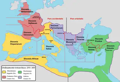 At the same time, there was a process of "Romanization" of the Germanic and Hunnic tribes. The Visigoths, for example, were converted to Arian Christianity around 360, even before they were pushed into imperial territory by the expansion of the Huns.[25]