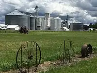 ![]() ![]() Top: Aerial view of Uniontown in 2023, Bottom: Uniontown grain elevators alongside the highway | |