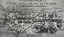 The Magasins Paris-Maroc building (1914), constructed by Hippolyte Delaporte and Auguste Perret, was located at the southern end of Place de France.[1][2] in 1915, Hubert Lyautey inaugurated the new Casablanca branch of the State Bank of Morocco was inaugurated on the square's northeastern side.[3][4] The Neo-Mauresque Hotel Excelsior, which remains today, was built in 1916.[5]