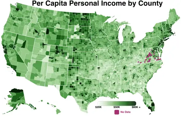 This is a list of United States counties by per capita income. Data for the 50 states and the District of Columbia is from the 2009–2013 American Community Survey 5-Year Estimates; data for Puerto Rico is from the 2013–2017 American Community Survey 5-Year estimates, and data for the other U.S. territories is from the 2010 U.S. Census.[1][2][3][4] State income levels and income data for the United States as a whole are included for comparison. County-equivalents in Louisiana are called "parishes" and in Alaska are called in "boroughs," and also in Alaska census areas in the Unorganized Borough are county-equivalents. For states where independent cities are county-equivalents, the word "city" is included to identify the independent cities and to differentiate them from counties with identical names; the counties with the identical names have the word "county" following them. The word "county" is included in the names of counties that have names identical to the names of U.S. states or cities to differentiate them.