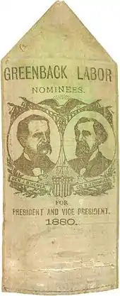 The Greenback Party convention gathered in Chicago in mid-June, using the hall recently vacated by the Republicans.[27] The party was a newcomer to the political scene in 1880, having arisen as a response to the economic depression that followed the Panic of 1873, mostly in the nation's West and South.[28] During the Civil War, Congress had authorized "greenbacks", a form of money redeemable in government bonds, rather than in gold, as was traditional.[29] After the war, many Democrats and Republicans in the East sought to return to the gold standard, and the government began to withdraw greenbacks from circulation.[30] The reduction of the money supply, combined with the economic depression, made life harder for debtors, farmers, and industrial laborers; the Greenback Party hoped to draw support from these groups.[28] Beyond their support for a larger money supply, they also favored an eight-hour work day, safety regulations in factories, and an end to child labor.[31]