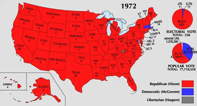 ![]() Presidential election results map. Red denotes states won by Nixon/Agnew and Blue denotes those won by McGovern/Shriver. Gold is the electoral vote for Hospers/Nathan by a Virginia faithless elector. Numbers indicate electoral votes cast by each state and the District of Columbia. | |||||||||||||||||||||||||||||