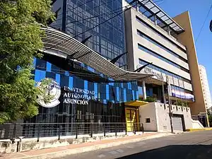 The Universidad Autónoma de Asunción (Autonomous University of Asuncion) is a private university.[1] It was founded in 1978 as the Escuela Superior de Administración de Empresas (Superior School of Business Administration). It obtained its title of university in 1991. As of 2006, it has 5000 students (undergraduate and graduate) and 350 professors.