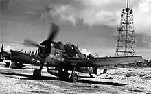 The squadron arrived at Naval Advance Base Espiritu Santo on May 4, 1944, and flew into Luganville Airfield the next day joining Marine Aircraft Group 21.[2] It remained there for nearly a month before the flight echelon departed on June 2, 1944, on the USS Santee (CVE-29).[2] The squadron's ground personnel were split between the USS Cetus (AK-77), SS Typhoon, and the SS Young.[2] After 65 days at sea, VMF(N)-534's, as part of Marine Aircraft Group 21, took off from the USS Santee, becoming the first aviation unit to land on Guam as they touched down on Orote Field on August 4, 1944.[6] The first combat air patrols commenced on August 7, 1944.[4] That same evening VMF(N)-534 also conducted its first night raids when a section of aircraft strafed the Japanese garrison on Rota. Between August 7 and December 29 the squadron conducted a total of eight strafing/bombing missions against Rota Island.[2] While on Guam squadron personnel conducted numerous patrols and assisted in burying Japanese war dead. From August 4 through December 31, VMF(N)-534 flew 1402 sorties totaling 2,610.6 hours of flying conducting nighttime CAP, strafing and bombing, and search missions. Test flight, fighter cover and ferrying missions accounted for another 491.6 hours.
