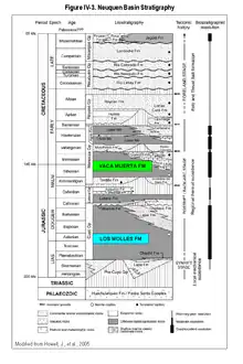 The Vaca Muerta Formation represents the most distal facies of the Lower Mendoza Mesosequence, a Tithonian–Valanginian broad shallowing-upward sedimentary cycle.[16] In the southern part of the Neuquén Basin the Lower Mendoza Mesosequence includes the basinal deposits of the Vaca Muerta Formation (early to middle Tithonian), which to the south-southeast change to mixed carbonate-siliciclastic nearshore deposits of the Carrin Cura Formation (lower part of the middle Tithonian) and Picún Leufú Formation (middle Tithonian – lower Berriasian), and to continental deposits of the Bajada Colorada Formation of Tithonian – Berriasian age.[17][18][19] In the central part of the Neuquén Basin, also known as Neuquén embayment, the Lower Mendoza Mesosequence consists of basinal deposits of the Vaca Muerta Formation (early to upper Tithonian), which to the east change to shoreface deposits of the Quintuco Formation (upper Tithonian – lower Valanginian), and to sabkha deposits of the Loma Montosa Formation (lower Valanginian), forming a mixed carbonate-siliciclastic depositional system.[20][21] Westward the Vaca Muerta Formation includes slope facies (Huncal Member), and in the Chilean territory pass into shallow marine/volcanic deposits.[22][23][24] By contrast, in the southern Mendoza area the Lower Mendoza Mesosequence consists of aggradational and divergent sequences, with a maximum thickness of 500 metres (1,600 ft) towards the center of the basin.[16] It includes basinal to middle carbonate ramp deposits of the Vaca Muerta Formation (early Tithonian – early Valanginian) and middle to inner ramp oyster-deposits of the Chachao Formation (early Valanginian), which form an homoclinal carbonate ramp system.[25][26][27] Westward, undated tidal to continental mixed deposits have been recognized and correlated with the Vaca Muerta and Chachao Formations, receiving the name of Lindero de Piedra Formation.[28]