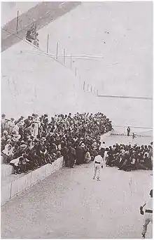 Trinquet ready for an Escala i corda game - Trinquet: There is a 60-by-10-metre (196 ft 10 in × 32 ft 10 in) four walled court with stairs (escala) on one side for the spectators to sit. There are also two galleries over each of the frontons (shortest walls) for people to sit. There is a bottom balcony (llotgeta) where reputed people or professional betters may sit, similar to a box in other stadiums. Next to the llotgeta a square is drawn on the ground: the dau, where players start the game. In order to play Escala i corda rules a 2-metre (6 ft 7 in) high net (corda) must be placed in the middle of the court. One of the most reputed is the Pelayo trinquet in Valencia. See also the List of Valencian trinquets.