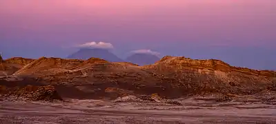 El Valle de la Luna (Valley of the Moon) is located 13 kilometres (8 mi) west of San Pedro de Atacama, in the north of Chile in the Cordillera de la Sal, in the Atacama desert. It has various stone and sand formations which have been carved by wind and water. It has an impressive range of color and texture, looking somewhat similar to the surface of the Moon. There are also dry lakes where the composition of salt makes a white covering layer of the area. It presents diverse saline outcrops which appear like man-made sculptures. There are also a great variety of caverns. When the sun sinks it defines the landscape while the wind blows among the rocks and the sky passes from pink color to purple and finally black. Valle de la Luna is a part of the Reserva Nacional los Flamencos and was declared a Nature Sanctuary in 1982 for its natural environment and strange lunar landscape, from which its name is derived.[1] The Atacama desert is also considered one of the driest places on earth, as some areas have not received a single drop of rain in hundreds of years.[2] A prototype for a Mars rover was tested there by scientists because of the valley's dry and forbidding terrains.[3]