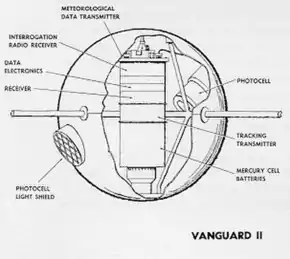 Vanguard 2 (or Vanguard 2E before launch) is an Earth-orbiting satellite launched 17 February 1959 at 15:55:02 GMT, aboard a Vanguard SLV-4 rocket as part of the United States Navy's Project Vanguard.[4] The satellite was designed to measure cloud cover distribution over the daylight portion of its orbit, for a period of 19 days, and to provide information on the density of the atmosphere for the lifetime of its orbit (about 300 years).[5][6] As the first weather satellite and one of the first orbital space missions, the launch of Vanguard 2 was an important milestone in the Space Race between the United States and the Soviet Union.[7][8][5] Vanguard 2 remains in orbit.