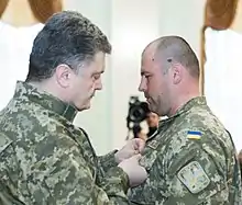 Zubanych (right) receives the Gold Star of a Hero of Ukraine from Poroshenko
