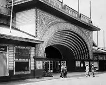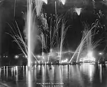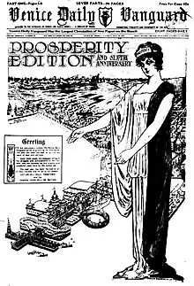Tourists, mostly arriving on the "Red Cars" of the Pacific Electric Railway from Los Angeles and Santa Monica, then rode the Venice Miniature Railway and gondolas to tour the town.[9] The biggest attraction was Venice's 1-mile-long (1.6 km) gently-sloping beach.[10] Cottages and housekeeping tents were available for rent.[11][12]