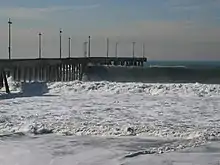 Along the southern portion of the beach, at the end of Washington Boulevard, is the Venice Fishing Pier. A 1,310-foot (400 m) concrete structure, it first opened in 1964, was closed in 1983 due to El Niño storm damage, and re-opened in the mid-1990s. On December 21, 2005, the pier again suffered damage when waves from a large northern swell caused part of it to fall into the ocean.[51] The pier remained closed until May 25, 2006, when it was re-opened after an engineering study concluded that it was structurally sound.