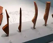 ![]() Venus figurines from Gönnersdorf, replica from the Landesmuseum Bonn: No 10: Figurine of bone No 11: Figurine of antler No 12: Figurine of ivory No 13: unfinished figurine of antler | |