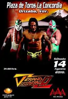 Verano de Escándalo (2010) was a major professional wrestling event produced by AAA, which took place on August 14, 2010. It was originally scheduled to take place at Arena Monterrey in Monterrey, Nuevo León, Mexico but due to Nuevo León suffering damage from Hurricane Alex the show was moved to Plaza de Toros la Concordia in Orizaba, Veracruz.[1] The show was the 14th show promoted under the Verano de Escándalo name. The title is Spanish for "Summer of Scandal" and has been AAA's annual summer show since 1997. It featured a double main event with the first match being a three way match for the AAA Mega Championship with reigning champion Dr. Wagner Jr. successfully defending against his brother Silver King and Vampiro. The other main event is a "AAA vs. Perros del Mal" six man tag team match pitting AAA representatives La Parka, Cibernético and El Mesias against Perros Perro Aguayo Jr., L.A. Park and Damián 666 which Los Perros del Mal won when Perro Aguayo Jr. pinned El Mesias. The show also saw the AAA Reina de Reinas Championship change hands as Mari Apache won the title from Sexy Star.