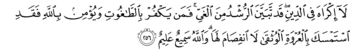 لَآ إِكْرَاهَ فِى ٱلدِّينِ صلے قَد تَّبَيَّنَ ٱلرُّشْدُ مِنَ ٱلْغَىِّ ج فَمَن يَكْفُرْ بِٱلطَّٰغُوتِ وَيُؤْمِنۢ بِٱللَّهِ فَقَدِ ٱسْتَمْسَكَ بِٱلْعُرْوَةِ ٱلْوُثْقَىٰ لَا ٱنفِصَامَ لَهَا قلے وَٱللَّهُ سَمِيعٌ عَلِيمٌ ٢٥٦