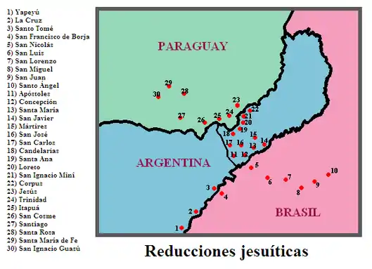 - ↑ An early bandeira in 1628, led by Antônio Raposo Tavares, composed of 2,000 allied Indians, 900 Mamluks (Mestizos) and 69 white Paulistanos, to find precious metals and stones and / or to capture Indians for slavery. This expedition alone was responsible for the destruction of most of the Jesuit missions of Spanish Guairá and the enslavement of more than 60,000 indigenous people. In response, the missions that followed were militarized.