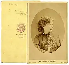 While Woodhull's earlier radicalism had stemmed from the Christian socialism of the 1850s, for most of her life, she was involved in Spiritualism and she did not use religious language in her public speeches. However, in 1875, Woodhull began to publicly espouse Christianity and she changed her political stances.[36] She exposed Spiritualist frauds in her periodical, alienating her Spiritualist followers.[37] She wrote articles against promiscuity, calling it a "curse of society".[38] Woodhull repudiated her earlier views on free love, and began idealizing purity, motherhood, marriage, and the Bible in her writings.[39][40][41] She even claimed that some works had been written in her name without her consent.[42] Historians doubt that assertion by Woodhull.[43]