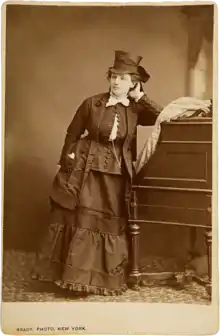 Woodhull twice went from rags to riches, her first fortune being made on the road as a magnetic healer[5] before she joined the spiritualist movement in the 1870s.[6] Authorship of many of her articles is disputed (many of her speeches on these topics were collaborations between Woodhull, her backers, and her second husband, Colonel James Blood[7]). Together with her sister, Tennessee Claflin, she was the first woman to operate a brokerage firm on Wall Street,[8] making a second, and more reputable fortune.[9] They were among the first women to found a newspaper in the United States, Woodhull & Claflin's Weekly, which began publication in 1870.[10]