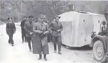 He was quartermaster colonel[2][3] in the Austro-Hungarian Army.[4] After World War I he was a journalist. He was often attacked by the Yugoslav gendarmerie. In 1924 he was arrested because of an illegal border pass, in 1929 he was accused of terrorism, then he was judged together with Vladko Maček. In 1933 he was arrested because of spreading leaflets. He was a close associate of Vladko Maček[5] After the proclamation of the Independent State of Croatia he joined the Croatian Domobranstvo, a regular army of the Croatia at the time. He was promoted to the rank of General of the infantry and on 14 August 1941 he was named state secretary in the Ministry of Defence.[6] He was advisor to Poglavnik Ante Pavelić. In April 1943 he escorted Pavelić in a visit to Adolf Hitler. At the beginning of September 1943 he was named as Doglavnik (deputy of Poglavnik) and thus became a member of Doglavničko vijeće (in English Doglavnik Council).[7] In May 1944 he became commander of the Coastal Section "Neretva". In August and in September 1944 he was commissioner of RAVSIGUR (Croatian: Ravnateljstvo sigurnosti, 'Directorate of Security') for the protection of the grand counties of Cetina, Usora, Soli, Vrhbosna, Hum and Dubrava. In February 1944 he was promoted to the rank of lieutenant general, and in April 1945 he was promoted to colonel general, the highest rank in the Croatian Armed Forces on the authority of Ante Pavelić. He also had the title of "vitez" (knight). In May 1945, when Croatian forces retreated to Austria to surrender to British, he disappeared[8] The former Minister of the Interior of the First Slovak Republic Alexander Mach who was being held as a prisoner of war in a US camp in Natternberg near Deggendorf in 1945 recounts Vilko Begić’ remarks in his diaries, e. g. in the entry for 31 July 1945, which implies that Vilko Begić was still arrested in the camp in Natternberg at that time.[9] Some say that US military authorities extradited him to the Communist Yugoslav military authorities, after which he was shot, but also, other versions say he was seen at an Allied camp near Salzburg in 1946, after that everything is unknown.
