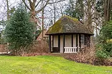 The garden also contains a teahouse situated close to the road. It was designed by Hanrath as well, and the building permit was granted in 1917.[3][11] The octagonal structure has clapboard siding and a thatched hip roof.[3][11] The front has a veranda with red tiles, a wooden balustrade, and four columns. In the original design, the entrance of the teahouse, consisting of sliding doors, with windows in the doors and on either side, was located behind the veranda.[11]