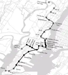 - ↑ Chen, David W. (September 10, 1995). "NEWS AND TOPICS: ROAD AND RAIL; On the Waterfront, a 20-Mile Trolley Chugs Closer to Reality". The New York Times.