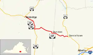 State Route 137 (SR 137) is a primary state highway in the U.S. state of Virginia. The state highway runs 12.03 miles (19.36 km) from SR 40 in Kenbridge east to SR 46 at Danieltown. SR 137 runs concurrently with SR 138 in eastern Lunenburg County and connects Kenbridge with SR 46, the main northsouth highway of Brunswick County.