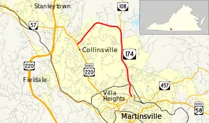 State Route 174 (SR 174) is a primary state highway in the U.S. state of Virginia. The state highway runs 5.58 miles (8.98 km) from U.S. Route 220 Business (US 220 Business) in Collinsville east to SR 457 in Martinsville. SR 174 is a C-shaped route between the de facto county seat of Henry County, Collinsville, and the nominal county seat and independent city of Martinsville.