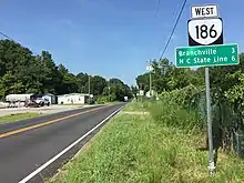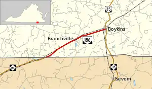 State Route 186 (SR 186) is a primary state highway in the U.S. state of Virginia. The state highway runs 6.21 miles (9.99 km) from the North Carolina state line near Branchville, where the highway continues west as North Carolina Highway 186 (NC 186), east to SR 35 in Boykins.