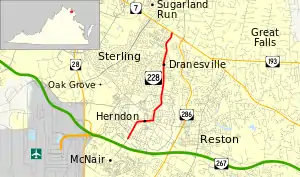 State Route 228 (SR 228) is a primary state highway in the U.S. state of Virginia. The state highway runs 4.53 miles (7.29 km) from SR 657 at the southern town limit of Herndon north to SR 7 near Dranesville. SR 228 is the main north–south highway through Herndon, connecting the town directly with SR 7 and indirectly with SR 267 in northwestern Fairfax County.