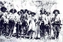 Lampião was joined in 1930 by his girlfriend, Maria Déia, nicknamed Maria Bonita ("Pretty Maria").[20] His relationship with Maria Bonita gave his reputation some of the 'romance and violence' notoriety enjoyed in the United States by Bonnie and Clyde.[21] The women who joined bandit groups, often termed cangaceiras, dressed like their male comrades and participated in many of their actions. Maria and Lampião had a daughter, named Expedita, in 1932. A number of cangaceiras joined the band over the many years of its existence and Lampião usually attended any births these women had personally. Such children, including Lampião's own, were fostered out to settled relatives or friends of the cangaceiros, or left with priests.[22] Expedita, after the deaths of her parents, was raised by her uncle, João. João Ferreira was the only one of Lampião's brothers not to become an outlaw.[23]