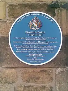 Francis Lovell, 9th Baron Lovell, 6th Baron Holand, later 1st Viscount Lovell, KG (1456 – probably 1487) was an English nobleman who was an ally of King Richard III during the War of the Roses. Sir William Catesby, Sir Richard Ratcliffe and he were among Richard's closest supporters, famously called "the Cat, the Rat and Lovell our dog" in an anti-Ricardian squib. In addition to being an ally, Lovell is described as Richard's best friend.[1]