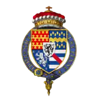 Richard acceded to the throne on 26 June 1483; at his coronation on 6 July 1483, Francis Lovell bore the third sword of state.[12] His wife, Anne, was part of the coronation train of the new queen along with her mother, Lady FitzHugh, and sister, Lady Elizabeth Parr.[13] Lovell was promoted to the office of Lord Chamberlain, replacing the late William Hastings,[14] and was made a Knight of the Garter in 1483.[15] Lovell helped in the suppression of Henry Stafford, 2nd Duke of Buckingham's rebellion (1483).