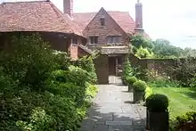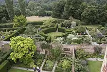 In 1930 the family acquired and moved to Sissinghurst Castle, near Cranbrook, Kent.[31] It had once been owned by Vita's ancestors. This gave it a dynastic attraction as she was excluded from inheriting Knole and a title.[1] Sissinghurst was an Elizabethan ruin and the creation of the gardens would be a joint labour of love that would last many decades, first entailing years of clearing debris from the land. Nicolson provided the architectural structure, with strong classical lines, which would frame his wife's innovative informal planting schemes. She created a new and experimental system of enclosures or rooms, such as the White Garden, Rose Garden, Orchard, Cottage Garden and Nuttery. She also innovated single colour-themed gardens and design principles orientating the visitors' experience to discovery and exploration. Her first garden at Long Barn (Kent, 1915–1930) was experimental, a place of learning by trial and error and she carried over her ideas and projects to Sissinghurst, utilising her hard won experience.[31] Sissinghurst was first opened to the public in 1938.
