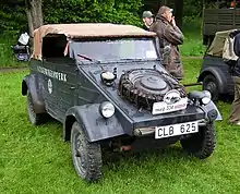 The Volkswagen Type 82 Kübelwagen (), or simply Kübel, ⓘ[2] contractions of the original German word Kübelsitzwagen (translated: 'bucket-seat car' — but when the contractions are translated literally a back-formation of 'bucket' or 'tub'-car results),[3] is a military light utility vehicle designed by Ferdinand Porsche and built by Volkswagen during World War II for use by the Nazi German military (both Wehrmacht and Waffen-SS). Based heavily on the Volkswagen Beetle, it was prototyped and first deployed in Poland as the Type 62, but following improvements entered full-scale production as the Type 82. Several derivative models, such as the Kommandeurswagen, were also built in hundreds, or in dozens.