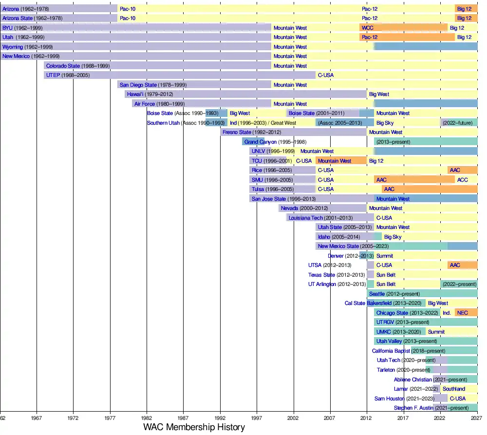 - ↑ The Colorado State men's basketball team joined the WAC a year after it became a full member for other sports (1969–70).