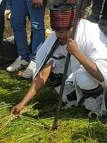 The Qaalluu is an important institution in the Oromo religious and social system.[12] It serves to protect the Oromo culture and tradition. Qaalluu is from the Oromiffa word qull, which translates as 'pure, holy, sacred, blameless, black'.[5] In the Qaalluu institution, the Qaallu (men) or Qaallitti/Ayyaantu (women) are believed to be messengers of Waaqa because they are attached to the Ayyaana.[10] The Qaalluu/Qaallitti serve as high ranked priests and ritual leaders that can officiate for Waqeffanna among the Oromo. There are a variety of myths on how the first Qaalluu (high priest) originated. While some believe they fell from the sky and others claim they were found with the first black cow, there is no consensus on their divine origin.[13] The Qaalluu and Qaallitti are believed to be the guardians of the laws of Waaqa. They live and perform ritual activities (dalalga) in the traditional Oromo ritual hall that is known as Galma.[14] A myriad of factors including seniority, acceptance in the community, moral qualification, social status and other leadership qualities are taken into consideration when a Qaalluu/Qaalliti is chosen.[4]