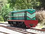 The railway is a key tourist attraction for Walhalla today, carrying around 35,000 passengers each year. The trains run on Wednesdays, Saturdays and Sundays departing Walhalla at 11 am, 1 pm and 3 pm (with no 3 pm service from June to August), with increased daily services in school holiday periods.[2] The train journey begins departing the Walhalla Heritage Precinct, travelling through the station yard between Stringers Creek and the cliff-face that underpins the Brunton's Bridge Road. The first kilometre and a half is almost entirely built over six large trestle bridges that criss-cross Stringers Creek Gorge in an effort to find anchorage for each bridge abutment.[3]