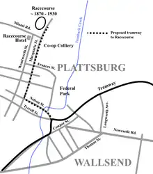 The Wallsend Races were popular. For some race days three crowded trams brought punters from the suburbs with tram-stops along the line from Newcastle to Jesmond and onto Wallsend tram terminus. The committee of Wallsend Jockey Club became motivated by a plan for a spur line to Macquarie Street (near Co-op Colliery) to 'deliver' the punters near to the racecourse.