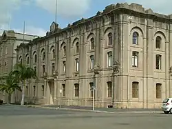 The former Walter Reid & Co warehouse in Quay Street, Rockhampton was erected for Walter Reid & Co in 1893 to the design of Richard Gailey. The three-storeyed rendered brickwork warehouse was the first of the two large Walter Reid warehouses to be constructed in Rockhampton which now dominate the precinct of similarly scaled structures in the area. It was part of the commercial infrastructure which developed near the wharves during a boom period in Rockhampton from the 1880s to the turn of the century. The structure displays its original design externally but has been rebuilt internally at least twice.[1]
