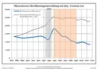 Development of Population since 1875 within the Current Boundaries (Blue Line: Population; Dotted Line: Comparison to Population Development of Brandenburg state; Grey Background: Time of Nazi rule; Red Background: Time of Communist rule)