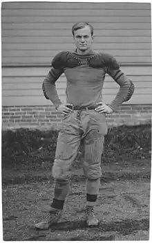 In those days, hazing was still an acceptable practice. The University of Washington had a traditional melee between each year's freshman and sophomore classes, the goal of which was to identify potential Huskies and to see who could tie up the others. It was at this inaugural event that Grimm earned the nickname "Wedge" that would identify him on football fields throughout the Northwest. Chosen Captain of the Freshman "tie-up" squad because of his size, Grimm actually showed his tactical acumen and organized his classmates into a tightly focused wedge that charged the sophomore formation.[2] This highly successful maneuver became a staple of Husky football teams and contributed to his later All-American honors.