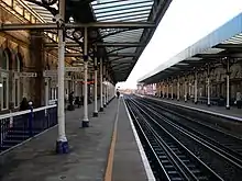 It had (and still has) two platforms on either side of two running lines with a subway between them at the Winwick Street end. This subway was later opened out to provide access direct from Winwick Street to each platform. Although the train timetable has often included passenger train services terminating at Warrington Central, there have never been any bay platforms. Terminating services use one of the two through platforms and usually proceed afterwards, as empty coaching stock, into the sidings to the east of the station[8]