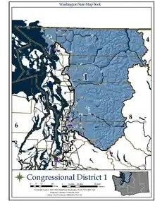 Prior to the 2012 redistricting, the district encompassed part of Northwest Seattle and largely suburban areas north and east of Seattle, including Shoreline, Edmonds, Lynnwood, Mountlake Terrace, Kenmore, Bothell, Kirkland, and Redmond, as well as Bainbridge Island and part of the Kitsap Peninsula. Until March 20, 2012, it was represented by Democrat Jay Inslee from Bainbridge Island. Inslee resigned to focus on his run for Governor of the state;[3] the seat remained vacant until the special election that coincided with the November 2012 general election.[4][5]