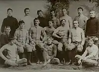 The development of intercollegiate athletics at Washington & Jefferson College began in 1890, when students formed the Athletic Association, charging the 75 members a $1 membership fee that went to fund athletics.[9] The football team played its first game on November 1, 1890, a 34–0 win against the Western University of Pennsylvania.[10] The Red and Black's third game of the inaugural season, against College of Wooster, remains disputed to this day, with both schools claiming a victory.[10] Controversy erupted over the referees' clock management when W&J's team, under the impression that the game was over, left the field with a 4–0 lead; Wooster continued to play and scored a touchdown and extra point to give them a disputed 6–4 victory.[10] By 1894, the college community's interest in the sport had grown considerably, with stronger opponents and the team's first paid coach, E. Gard Edwards.[10] A special train from Washington to Pittsburgh was chartered to carry fans and students to a watch a 6–0 victory against the semi-pro Pittsburgh Athletic Club.[10]