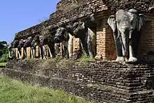 Wat Chang Lom (Thai: วัดช้างล้อม) is a temple complex consist of a large stupa in Lanka style with the remains of a gallery, the ruins of a vihara and an ordination hall, surrounded by moat. Numerous small stupas, of many is only the foundation remain, are scattered around the grounds. The large bell-shaped stupa stands on a square brick base with about 18 meters on each side. 32 elephant sculptures stand around the base. Each elephant seems to be on a small brick niche, only the front part of the elephant is visible. A square portico with brick foundation and remains of laterite pillars surrounding the stupa area at some distance. East of the Stupa are the ruins of a vihara with a Buddha image and round and square laterite pillars.
