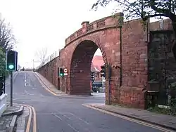 Watergate was built between 1788 and 1790 for Chester City Council and replaced a medieval gate that had been damaged during the siege of Chester.[2] The architect was Joseph Turner. It is built in red sandstone ashlar and consists of a basket arch of short rusticated voussoirs. The parapet consists of stone balusters interspersed with panels. A drinking fountain, which is now dry, is fixed to the north abutment and is dated 1857.[1]