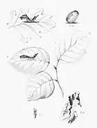 The larva is brown with yellow markings and shows the typical drepanid shape with a tapered tail. It usually feeds on oak, but has also been recorded on alder, beech, and birch. The species overwinters as pupae.