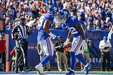 Gallman was selected by the New York Giants in the fourth round, 140th overall, in the 2017 NFL Draft.[32][33] He was the 14th running back selected in that year's draft.[34] Gallman made his NFL debut and scored his first NFL touchdown on October 1, 2017, in a loss to the Tampa Bay Buccaneers.[35] This game coincided with his 23rd birthday. Overall, in his rookie season, he finished with 476 rushing yards to go along with 34 receptions for 193 receiving yards and a receiving touchdown.[36] Gallman scored his first rushing touchdown in Week 17 against the Dallas Cowboys on a one-yard run.[37] Overall, he finished the 2018 season with 176 rushing yards and rushing touchdown.[38]