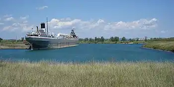 The Main Street Tunnel was officially opened on May 20, 1972, with the Townline Tunnel following on July 13. Rail traffic through the Townline Tunnel was inaugurated on January 31, 1973. The new canal was first traversed by the Canadian Coast Guard cutter Griffon on March 27, 1973.[3] The first commercial ship to pass through the by-pass was the M.V. Senneville on March 28, 1973. It carried a cargo of 1,063,868 bushels of barley in transit from Duluth, Minnesota to Port Cartier, Quebec.[4] The official opening ceremony for the Welland By-pass took place on July 14, 1973.
