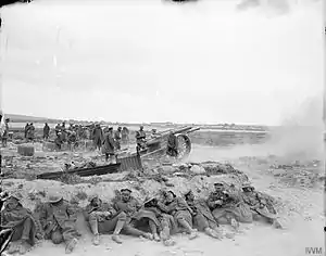 On 20 March the artillery preparation began for the Battle of Vimy Ridge, with the batteries of 31st HAG firing from around Bully-Grenay on the extreme north flank of the attack, from where they could virtually enfilade the German lines in support of I Corps. The artillery plan for the heavy guns emphasised counter-battery fire. At Zero hour, while the field guns laid down a Creeping barrage to protect the advancing infantry, the 60-pounders switched to 'searching' fire on the German rear areas to catch machine gunners and moving infantry. When the British infantry reached their Phase 2 objective (the Blue Line) the field guns would move forward and the 60-pounders move up to occupy their vacated positions. The attack went in on 9 April with I Corps and Canadian Corps successfully capturing Vimy Ridge while Third Army attacked further south near Arras. The only hold-up on 9 April was at Hill 145, near the north end of the Canadian attack, and the capture of this position was completed the next day. During the day the battery suffered several casualties from German CB fire.[22][30][31][32]
