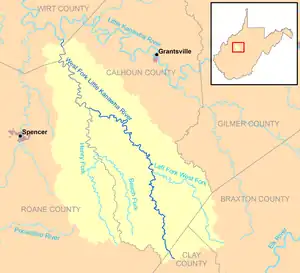 The West Fork Little Kanawha River is a tributary of the Little Kanawha River, 48.1 miles (77.4 km) long,[3] in west-central West Virginia in the United States. Via the Little Kanawha and Ohio rivers, it is part of the watershed of the Mississippi River, draining an area of 246 square miles (640 km2)[4] in a rural region on the unglaciated portion of the Allegheny Plateau. By drainage area, it is the second-largest tributary of the Little Kanawha River, after the Hughes River.[4]